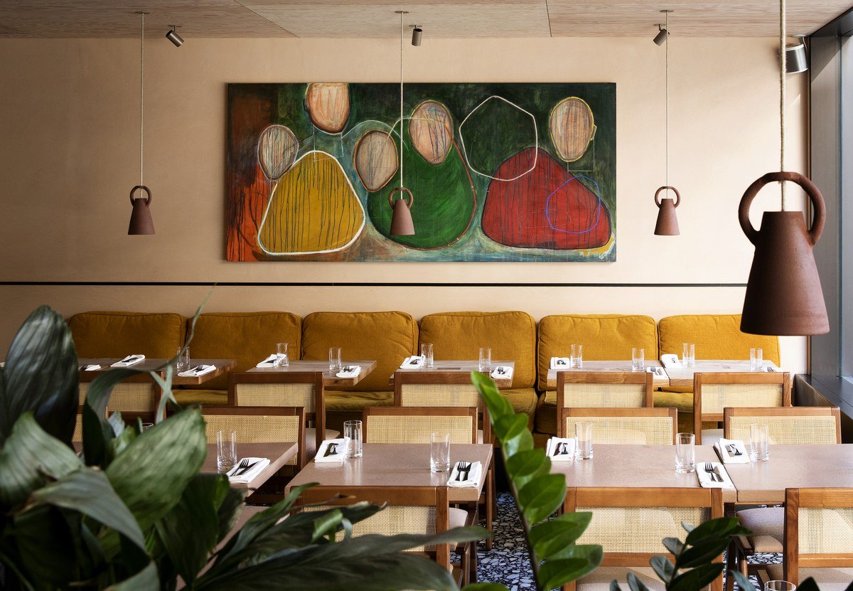 Flor, in Borough Market, comes with serious credentials; after all, it’s the long-awaited little sister to the Michelin-starred Lyle’s. Its ground-floor wine bar doubles as a bakery, already known for its sourdough; supplies are limited, so invest in a loaf on arrival. Stools—reserved for walk-ins—line the window and marble counter, which overlooks the kitchen (tiny is an understatement; even four chefs seems a squeeze). Up a spiral staircase, the dining room is surprisingly calm, with a double-height ceiling, bare brick walls, and petrol-blue banquettes.